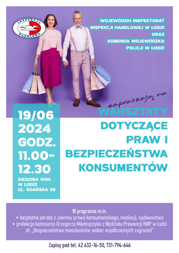 Wojewódzki Inspektorat Inspekcji Handlowej w Łodzi zaprasza 19 czerwca br. w godz. 11.00-12.30 na warsztaty dotyczących praw i bezpieczeństwa konsumentów, które odbędą się w siedzibie WIIH w Łodzi ul. Gdańska 38. Pracownicy WIIH przybliżą zagadnienia z zakresu prawa konsumenckiego, mediacji, sądownictwa polubownego natomiast komisarz Grzegorz Mikołajczyk z Wydziału Prewencji Komendy Wojewódzkiej Policji w Łodzi omówi zagadnienia związane z bezpieczeństwem mieszkańców wobec współczesnych zagrożeń.