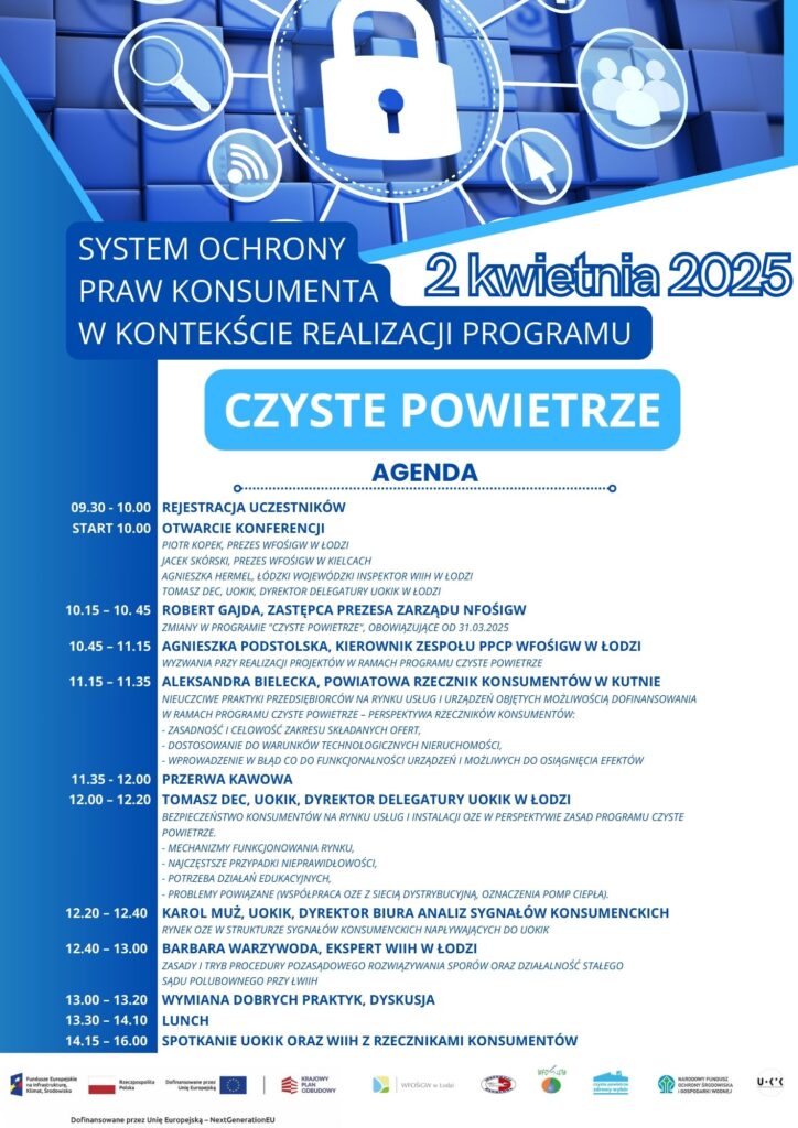 Wojewódzki Fundusz Ochrony Środowiska i Gospodarki Wodnej w Łodzi, Urząd Ochrony Konkurencji i Konsumentów – Delegatura w Łodzi oraz Wojewódzki Inspektorat Inspekcji Handlowej w Łodzi zapraszają do udziału w konferencji „System Ochrony Praw Konsumenta w Kontekście Realizacji Programu Czyste Powietrze”, która odbędzie się 2 kwietnia 2025 roku w siedzibie WFOŚiGW w Łodzi.