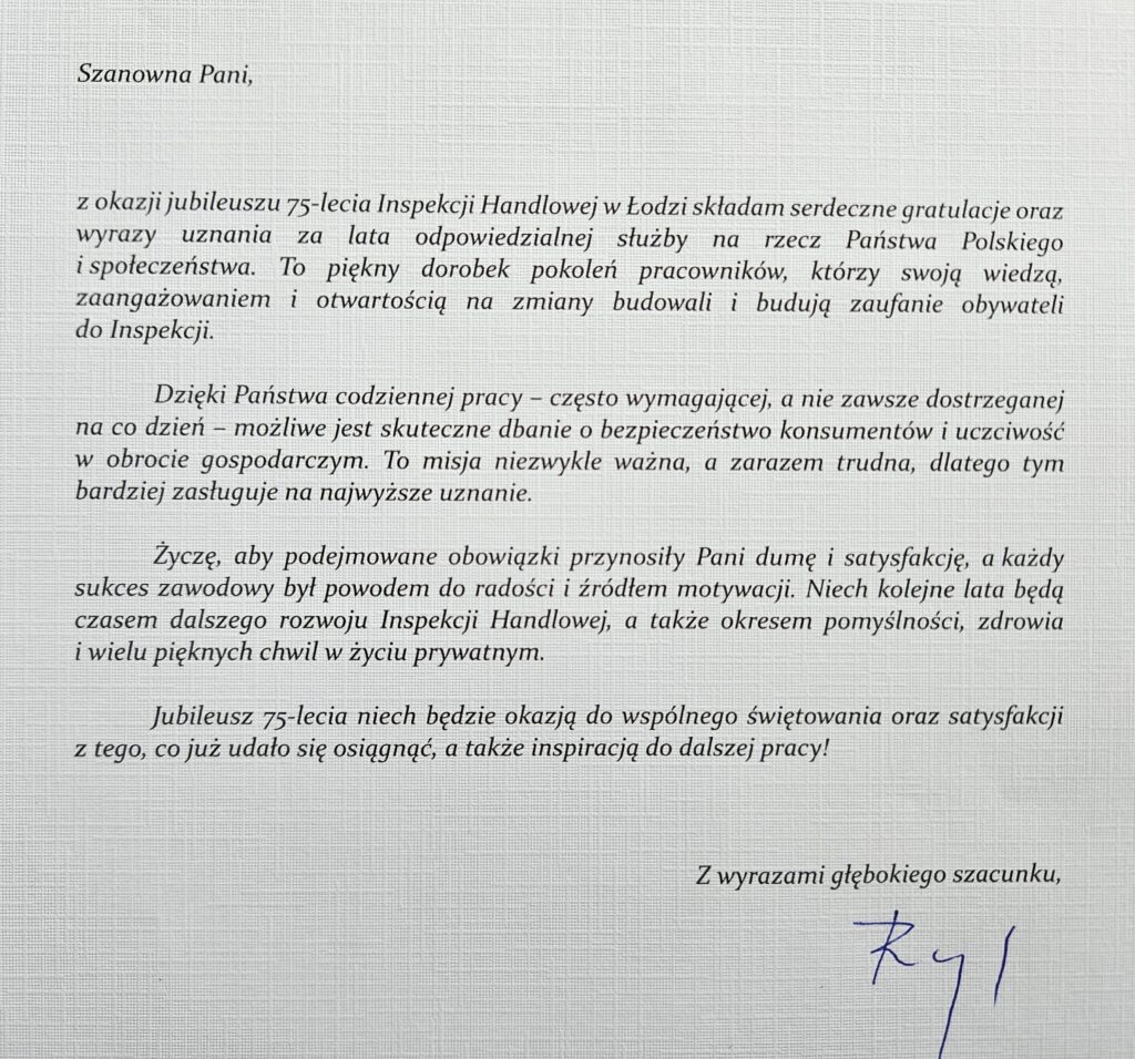18 września 2025 r. spotkaniem w Łódzkim Urzędzie Wojewódzkim zainaugurowane zostały obchody 75-lecia Inspekcji Handlowej. Podczas uroczystości, która miała charakter państwowy, Wojewoda Łódzki Dorota Ryl wręczyła medale za długoletnią służbę.