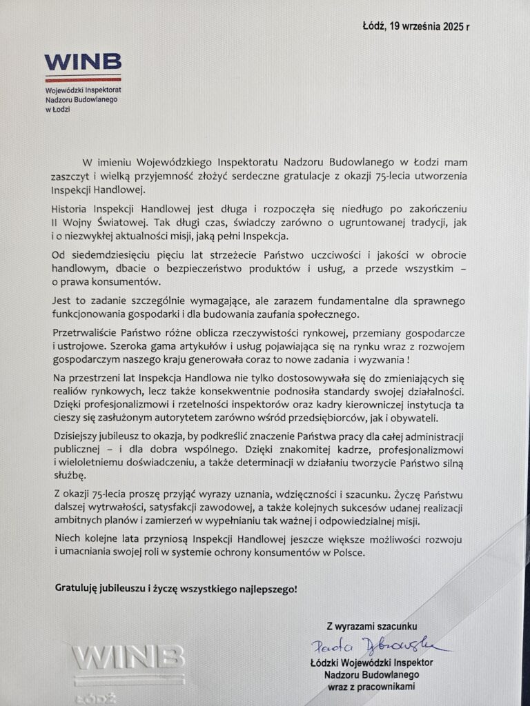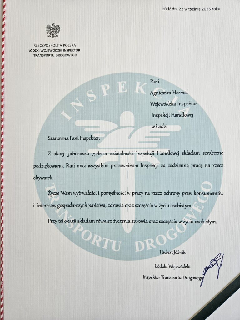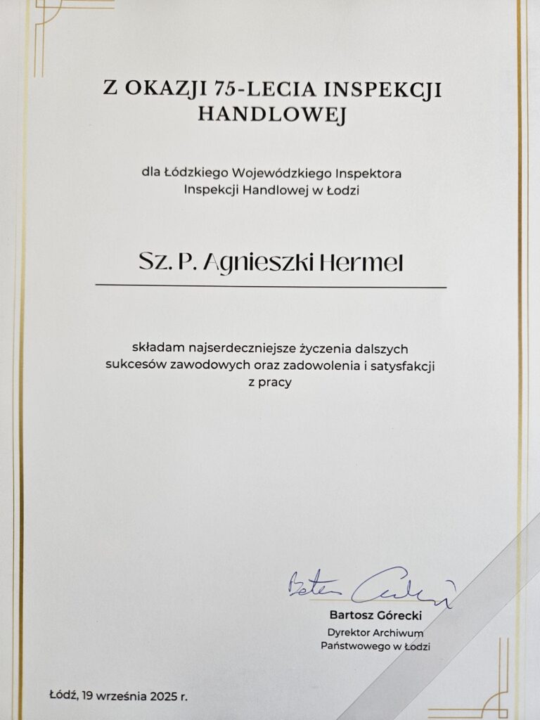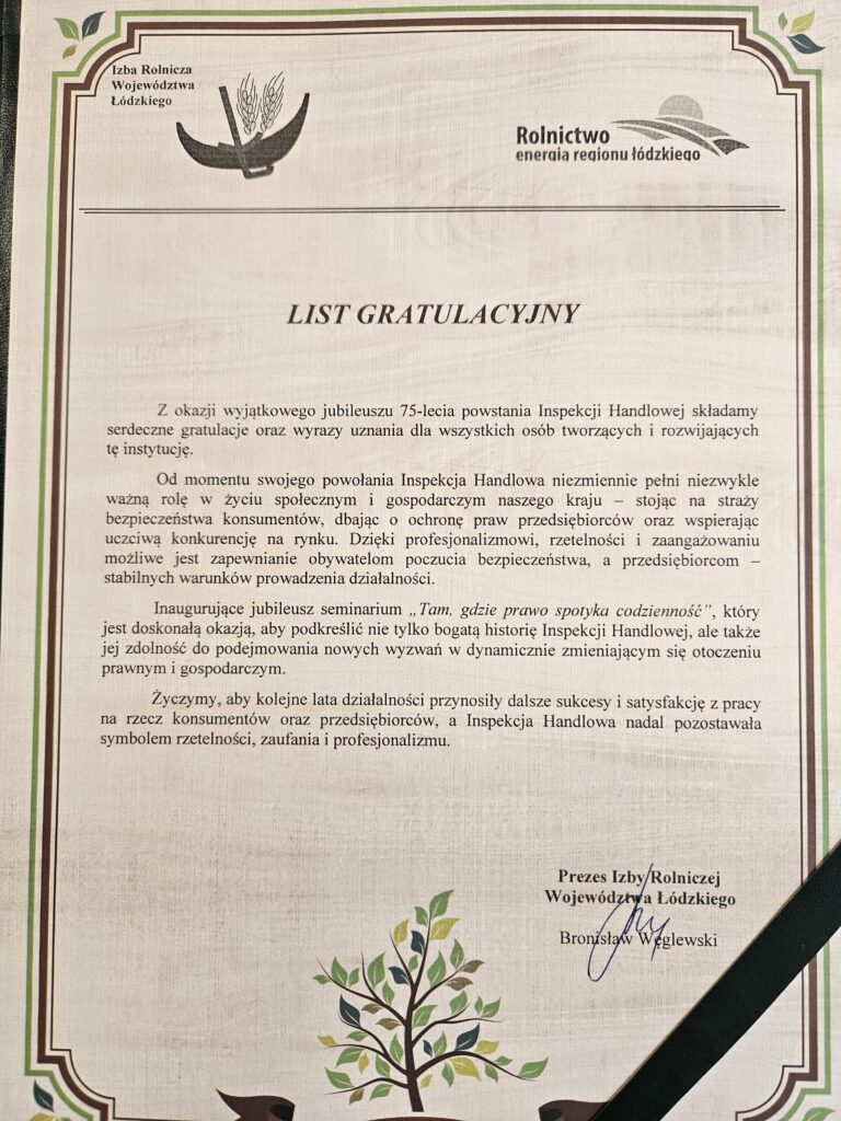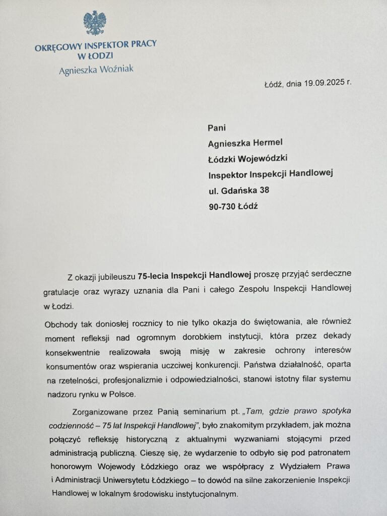 Serdecznie dziękujemy prelegentom, wszystkim zaproszonym gościom oraz wszystkim instytucjom, które skierowały na ręce Pani Agnieszka Hermel Łódzkiego Wojewódzkiego Inspektora Inspekcji Handlowej listy gratulacyjne.