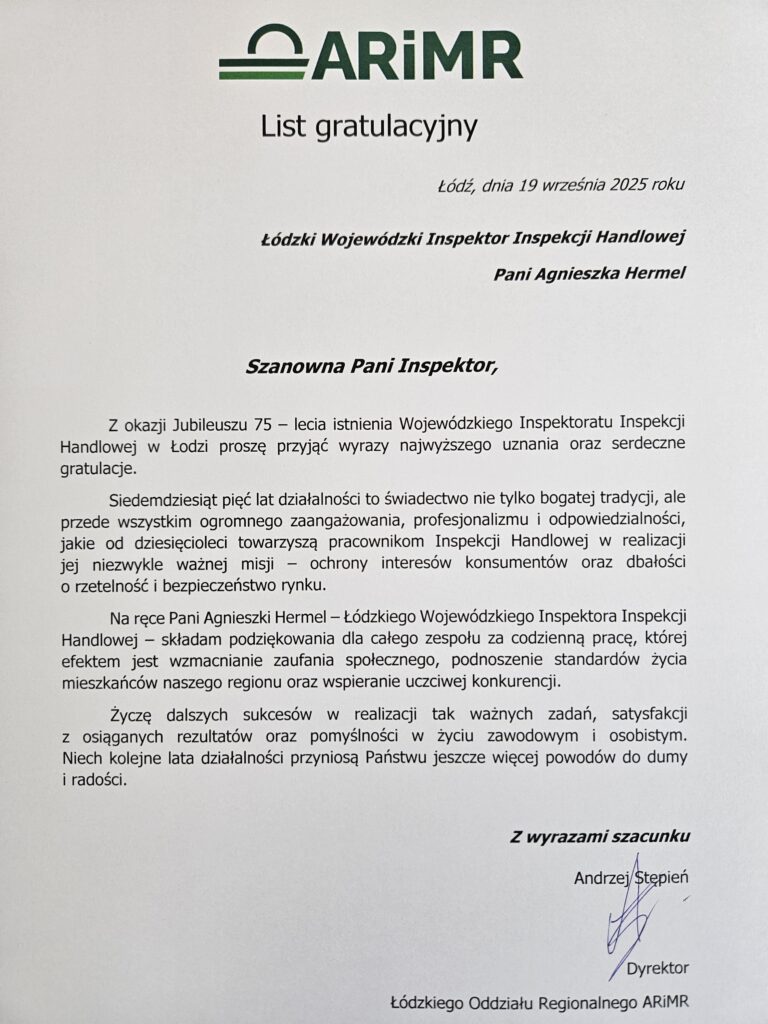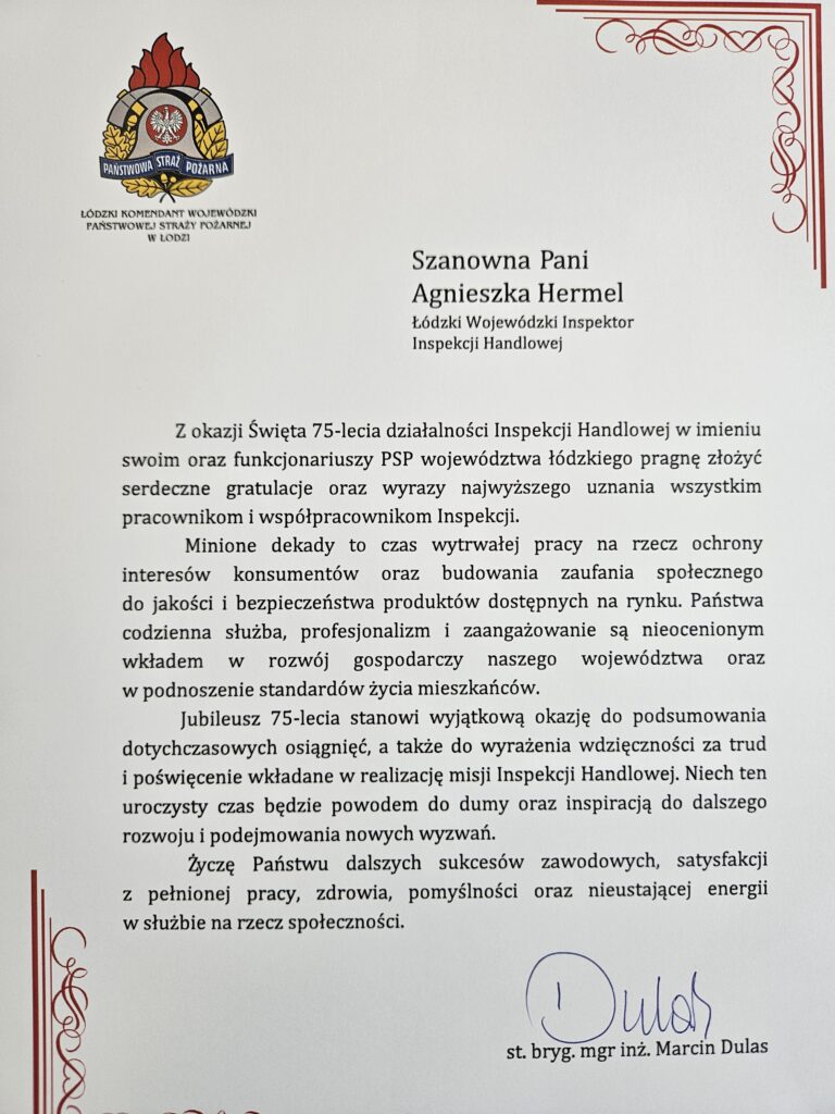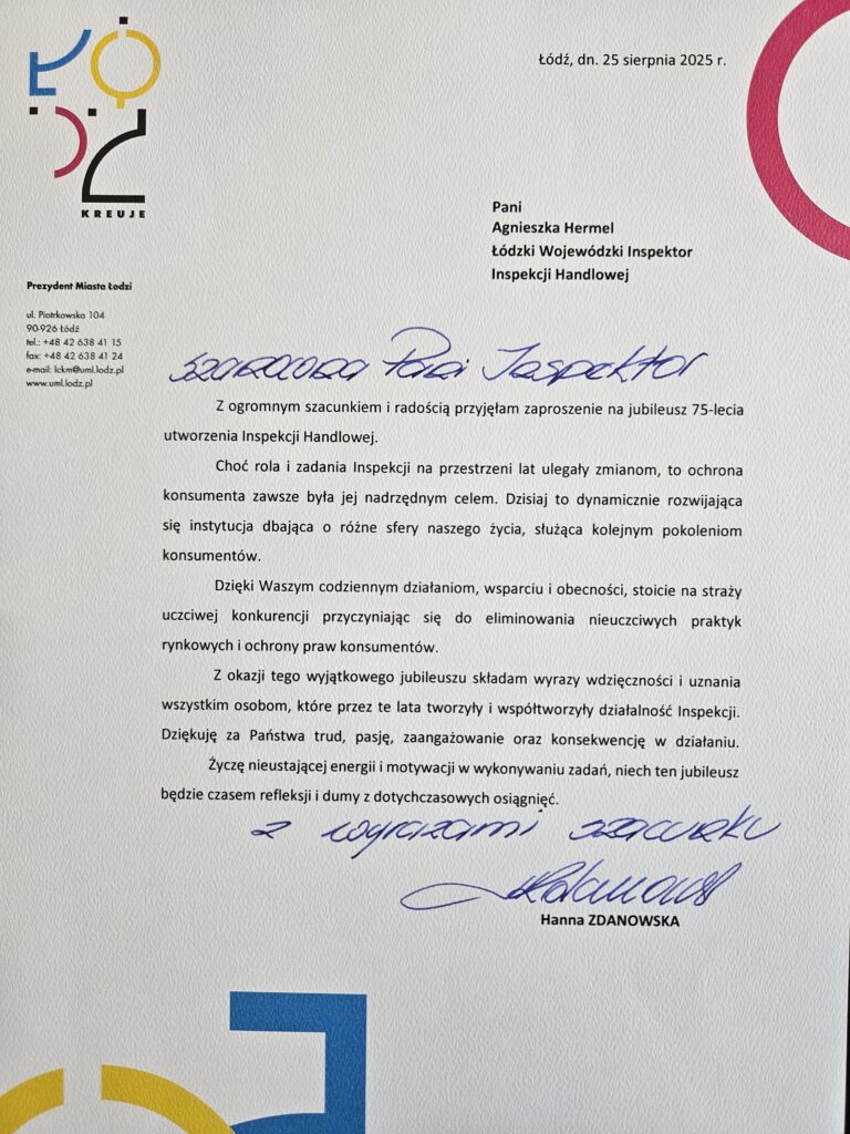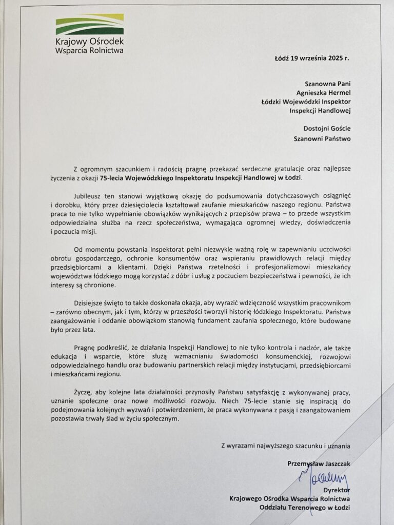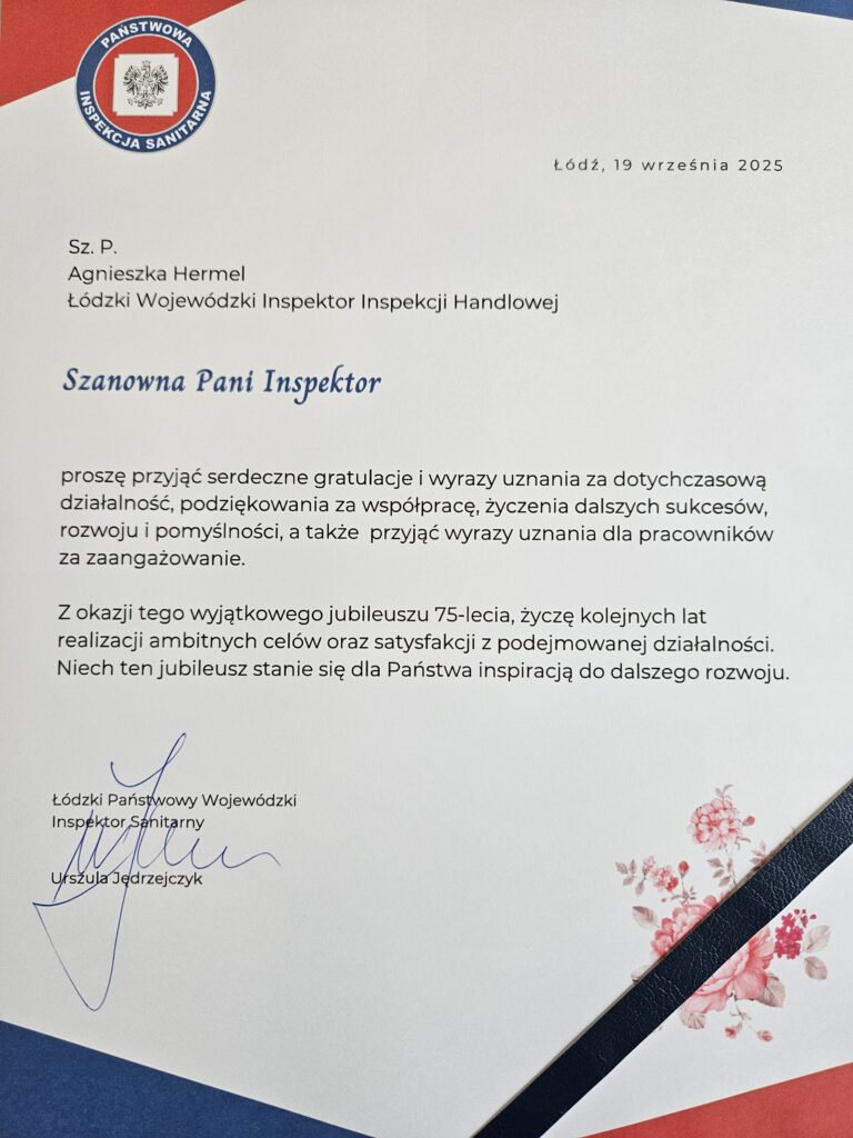 Serdecznie dziękujemy prelegentom, wszystkim zaproszonym gościom oraz wszystkim instytucjom, które skierowały na ręce Pani Agnieszka Hermel Łódzkiego Wojewódzkiego Inspektora Inspekcji Handlowej listy gratulacyjne.