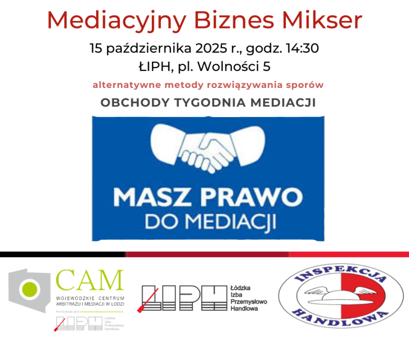 godz. 14:00-14:20 „Potencjał mediacji – praktyczne przykłady wykorzystania mediacji” – Monika Pujan – Dyrektor Wojewódzkiego Centrum Arbitrażu i Mediacji przy Łódzkiej Izbie Przemysłowo – Handlowej godz. 14:20-14:35 – „Dofinansowanie na szkolenia z mediacji” – Mateusz Stypułkowski, Businessland