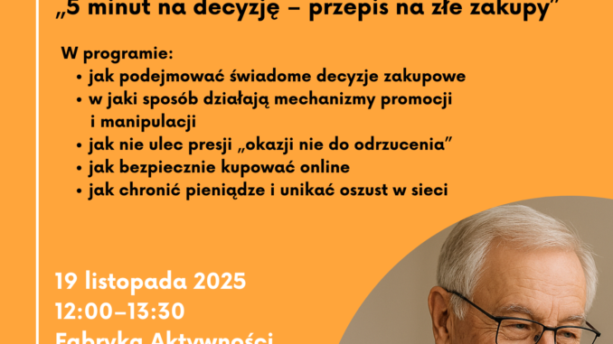 Z tej okazji Wojewódzki Inspektorat Inspekcji Handlowej w Łodzi, we współpracy z Komendą Miejską Policji w Łodzi, zaprasza na warsztaty edukacyjne „5 minut na decyzję – przepis na złe zakupy”, które odbędą się 19 listopada 2025 r. (środa), w godz. 12:00–13:30, w Fabryce Aktywności Miejskiej przy ul. Tuwima 10 w Łodzi.