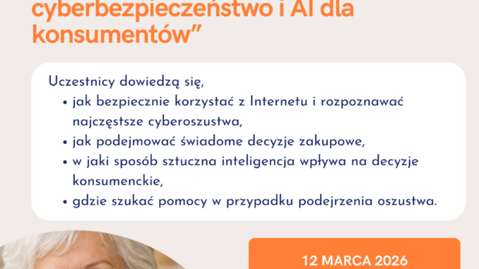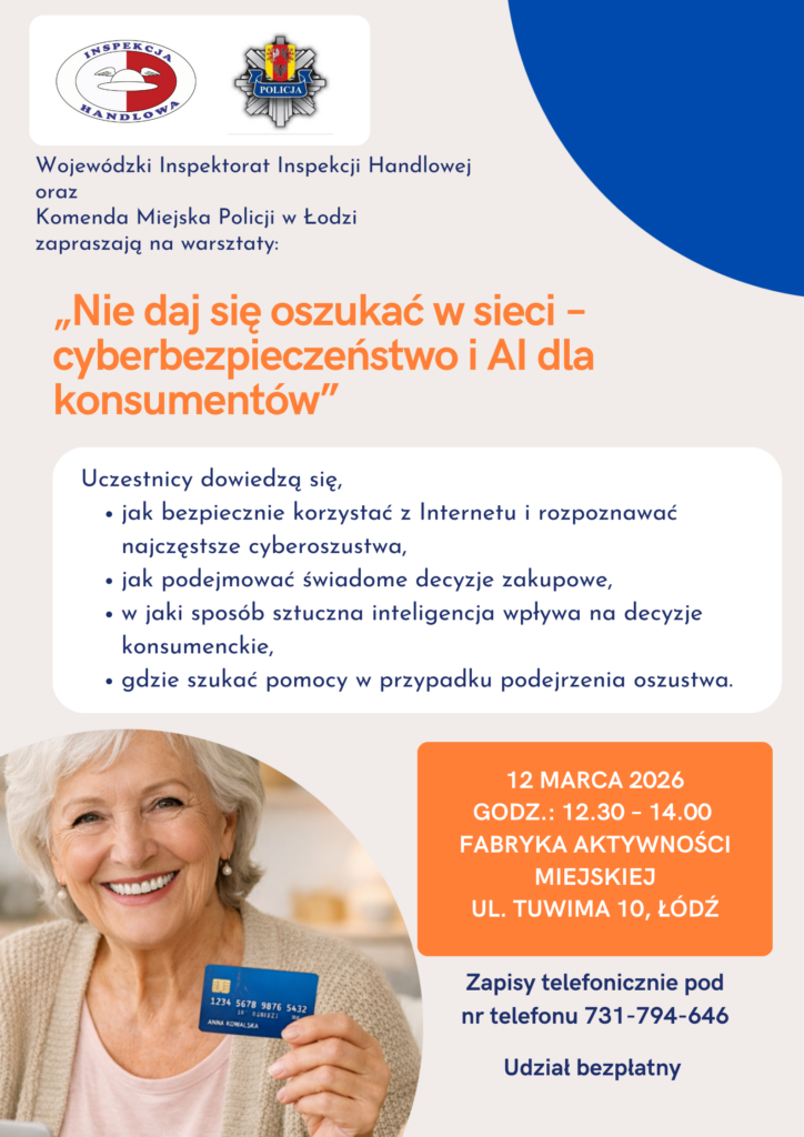 z Komendą Miejską Policji w Łodzi, zaprasza na bezpłatne warsztaty edukacyjne poświęcone bezpieczeństwu w sieci oraz świadomemu korzystaniu z nowych technologii, w tym sztucznej inteligencji pt.: „Nie daj się oszukać w sieci – cyberbezpieczeństwo i AI dla konsumentów”, które odbędą się 12 marca 2026 r. (czwartek), w godz. 12:30–14:00,